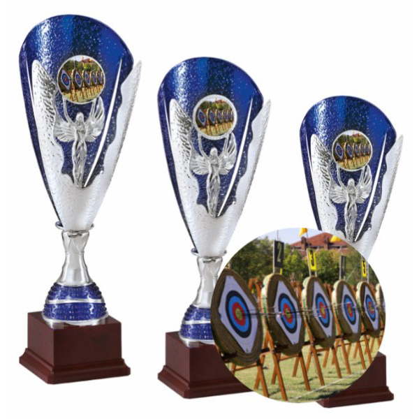 3 Coppe trofeo in metallo compongono una serie importante per premiare in una gara o manifestazione di tiro con l''arco. Componenti centrali e base in ABS. Inserto Ø mm. 50 con adesivo in rilievo di alta qualità con logo Tiro con l'Arco.