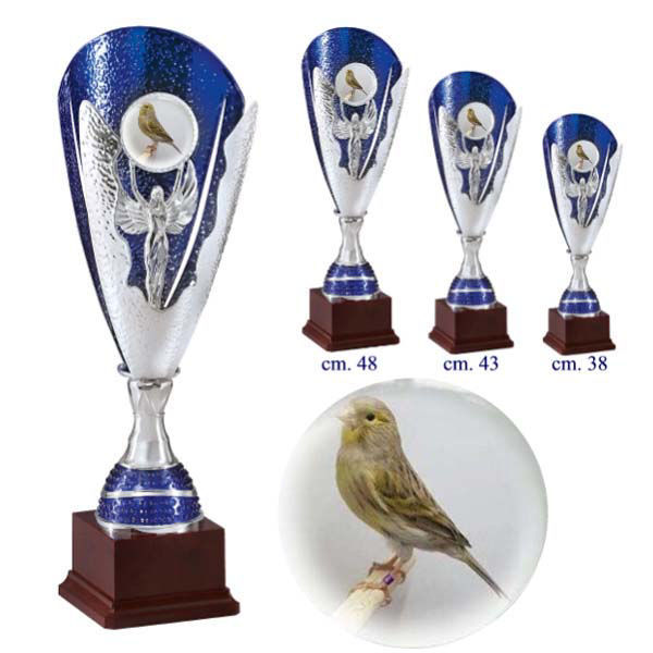 3 Coppe Trofeo in metallo compongono una serie importante per premiare in una manifestazione o concorso di ornitologia. Componenti centrali e base in ABS.