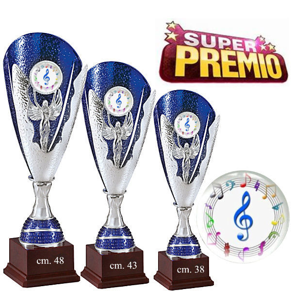 3 Coppe Trofeo in metallo compongono una serie importante per premiare in un evento canoro o musicale. Componenti centrali e base in ABS.