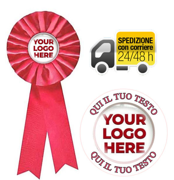 Elegante coccarda misura maxi di colore rosso.Misura cm. 30 e diametro esterno da cm. 12 Inserto Ø mm. 50 con adesivo in rilievo di alta qualità con il tuo testo, logo o progetto. Confezione in busta trasparente. Retro con aggancio in plastica.