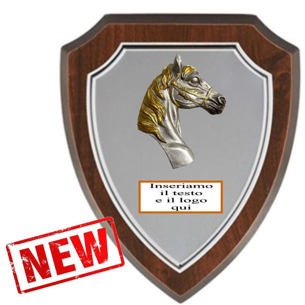 Crest in legno cm. 20 x 25,5Scudo in alluminio cm. 16 x 21 con Applique in resina "Testa di Cavallo" Personalizzazione dell'oggetto con etichetta in poliestere adesivo con testo, logo o con un tuo progetto.