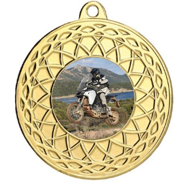 Medaglia in metallo diametro esterno mm. 50 - Inserto Ø mm. 25 con adesivo in rilievo di alta qualità. Disponibile nelle finiture oro - argento e bronzo.