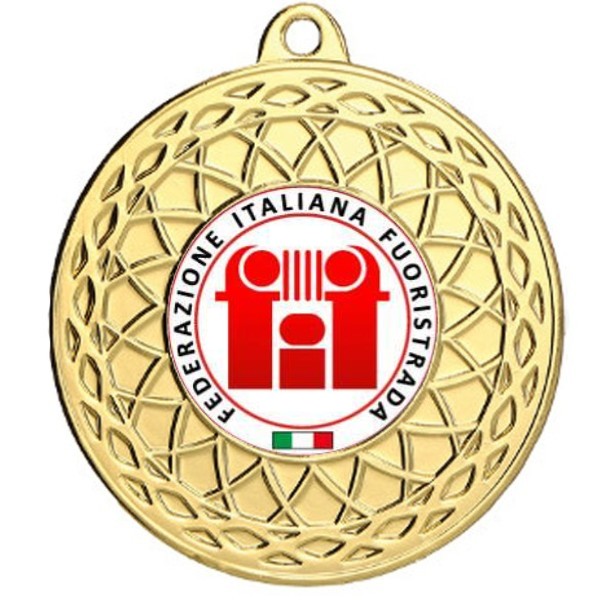 Medaglia in metallo diametro esterno mm. 50 - Inserto Ø mm. 25 con adesivo in rilievo di alta qualità. Disponibile nelle finiture oro - argento e bronzo.