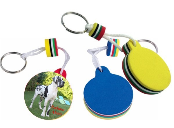 Portachiavi multistrato bicolore diametro mm. 50 con etichetta resinata adesiva effetto 3D.