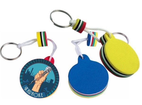 Portachiavi multistrato bicolore diametro mm. 50 con etichetta resinata adesiva effetto 3D.