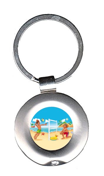 Portachiavi in metallo. Inserto centrale diametro mm. 21 con adesivo in rilievo di alta qualità con logo Beach Volley. Il portachiavi è fornito con scatolina.