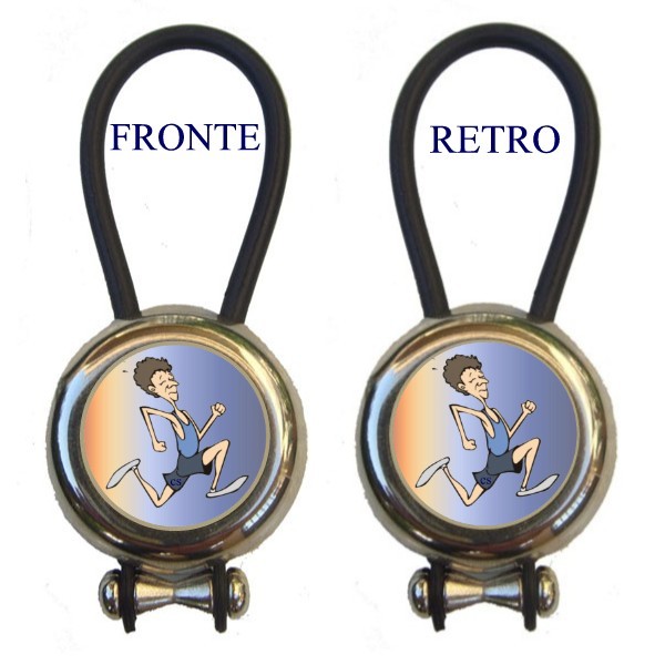 Portachiavi in metallo nichelato con cordino in caucciù e chiusura a perno. Inserti centrali con adesivo resinato Ø mm. 21 effetto 3D.