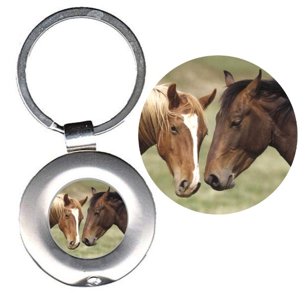 Portachiavi in metallo diametro mm. 36 con box. Inserto con adesivo in rilievo di alta qualità con logo. Il portachiavi è fornito con scatolina.