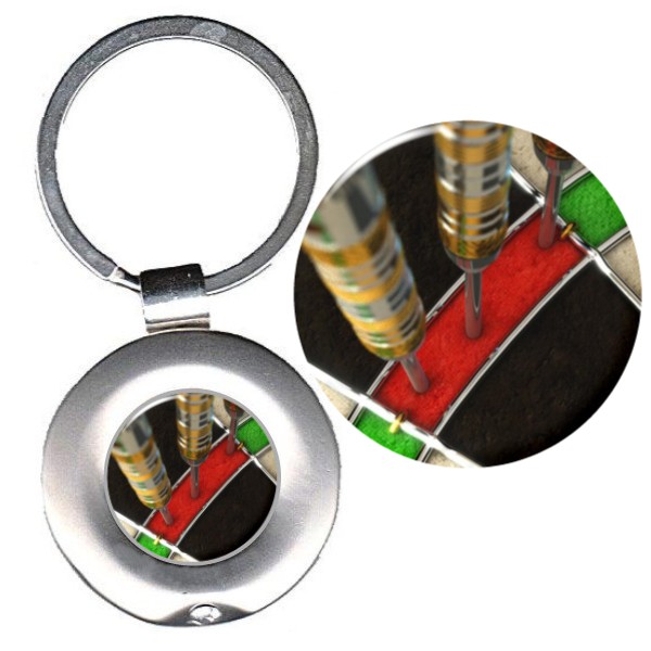 Portachiavi in metallo diametro mm. 36 con box. Inserto con adesivo in rilievo di alta qualità con logo. Il portachiavi è fornito con scatolina.