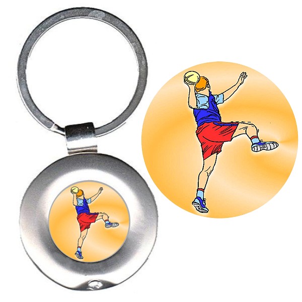 Portachiavi in metallo diametro mm. 36 con box. Inserto con adesivo in rilievo di alta qualità con logo. Il portachiavi è fornito con scatolina.