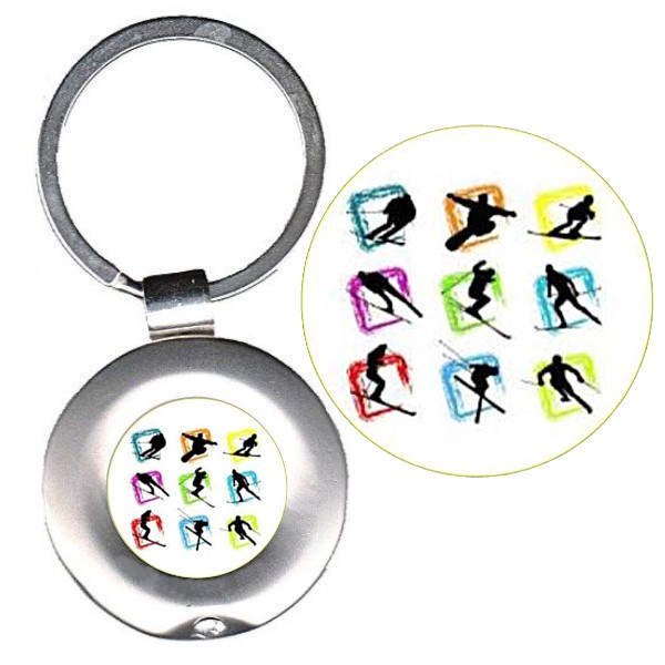 Portachiavi in metallo diametro mm. 36 Inserto con adesivo in rilievo di alta qualità con logo. Il portachiavi è fornito con scatolina.