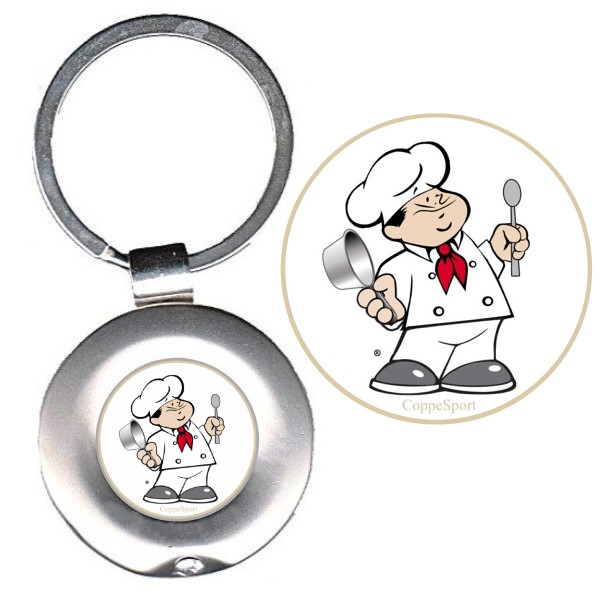 Portachiavi in metallo diametro mm. 36 con box. Inserto con adesivo in rilievo di alta qualità con logo. Il portachiavi è fornito con scatolina.