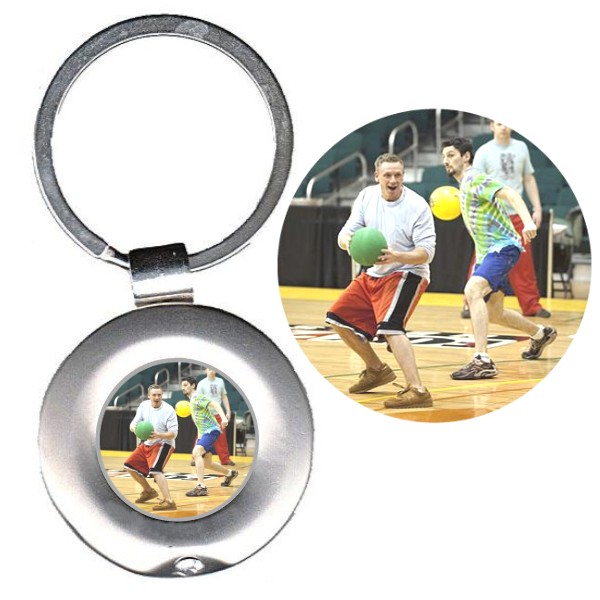Portachiavi in metallo diametro mm. 36 con box. Inserto con adesivo in rilievo di alta qualità con logo. Il portachiavi è fornito con scatolina.