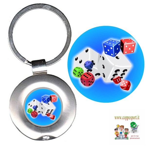 Portachiavi in metallo diametro mm. 36 con box. Inserto con adesivo in rilievo di alta qualità con logo. Acquista questo oggetto come gadget per il tuo evento di Dadi. Il portachiavi è fornito con scatolina.