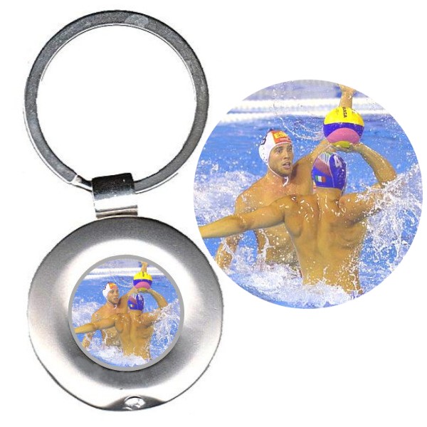 Portachiavi in metallo con box. Inserto con adesivo in rilievo di alta qualità Ø mm. 21 con logo Pallanuoto. Il portachiavi è fornito con scatolina.