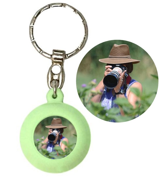 Portachiavi bifacciale in gomma profumata. Il portachiavi di colorazione verde acqua ha un gradevole odore. Inserto centrale resinato Ø mm. 21 effetto 3D su entrambi i lati.