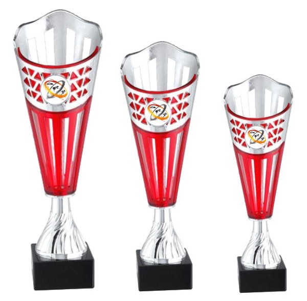 Articolo formato da 3 Coppe con tazza e componenti intermedi in ABS dal colore esterno rosso e interno argentato con base in marmo. Le 3 coppe hanno le seguenti dimensioni: 1^ Coppa - Altezza cm. 31 2^ Coppa - Altezza cm. 29 3^ Coppa - Altezza cm. 25 Personalizzazione sul fronte della base mediante l'applicazione di una etichetta in poliestere adesivo con il tuo testo inclusa nel prezzo.