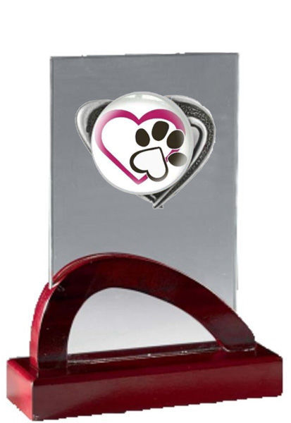 Premio in vetro altezza cm. 17 con base in legno.Applique in resina "cuore" con adesivo in rilievo di alta qualità Ø mm. 50 con logo Cinofilia.