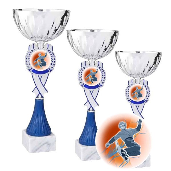 Serie di 3 Coppe con tazza in metallo. Base in marmo. Inserto con adesivo in rilievo di alta qualità con logo Skateboard per valorizzare la tua premiazione. Acquistando questo articolo riceverai 3 coppe: 1° Classificato - Altezza cm. 37 - Diametro cm. 16 2° Classificato - Altezza cm. 35 - Diametro cm. 14 3° Classificato - Altezza cm. 33 - Diametro cm. 12 Personalizzazione sul fronte della base mediante l''applicazione di una etichetta in poliestere adesivo inclusa nel prezzo.