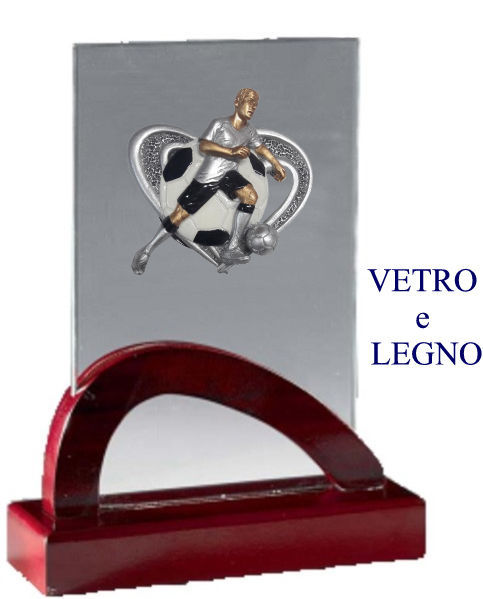 Premio in vetro cm. 17 con base in legno con applique in resina per il Calcio.