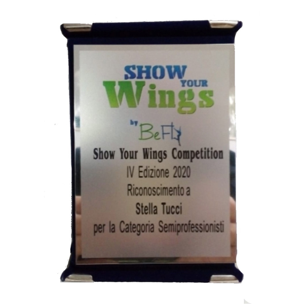 Targa in alluminio formato cm. 8x10 con elegante folder in velluto blu cm. 9x12.