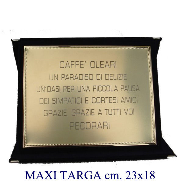 Targa in alluminio dorato cm. 23 x 18 (bordino variabile) con folder vellutato di colore blu.