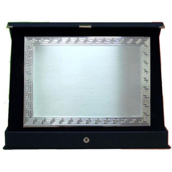 Elegante targa in fine ottone silver cm. 17x12 contenuta in un astuccio di velluto blu.
