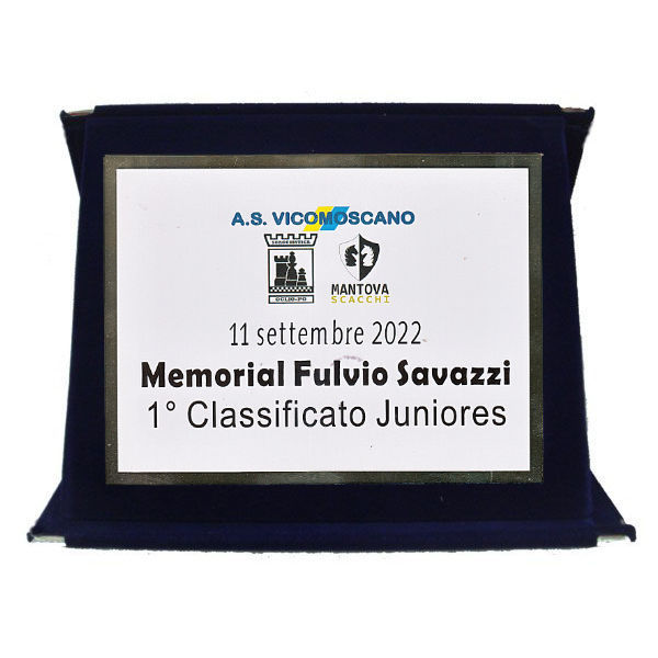 Targa in alluminio con fondo bianco cm. 20 x 15 con elegante folder vellutato. L'oggetto viene personalizzato con del testo, logo o con un tuo progetto.