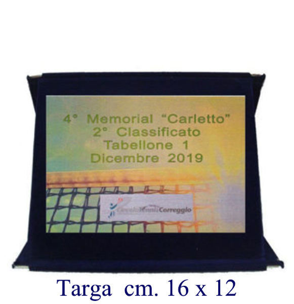 Targa in alluminio cm. 16 x 12 con elegante folder vellutato. L'oggetto viene personalizzato con stampa digitale. E' possibile, oltre al testo, inserire anche un logo.