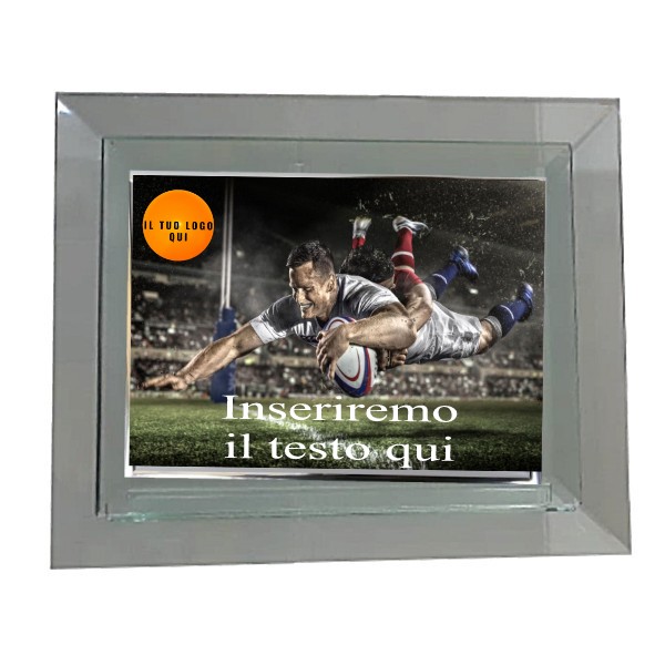 Porta targa in cristallo cm. 20 x 17 con targa in alluminio. Elegante premio per la tua manifestazione di Rubgy. Personalizzazione dell''oggetto con stampa digitale con testo e logo.