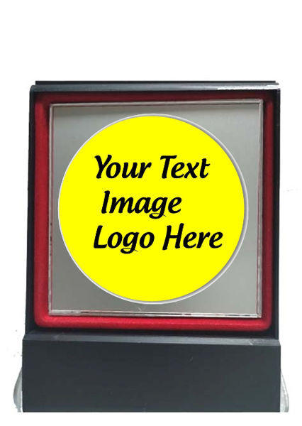 Targhetta cm. 7,8 x 7,8 in alluminio color argento. Fornita con astuccio in plastica cm. 9 x 12. L'astuccio aperto funge da supporto.