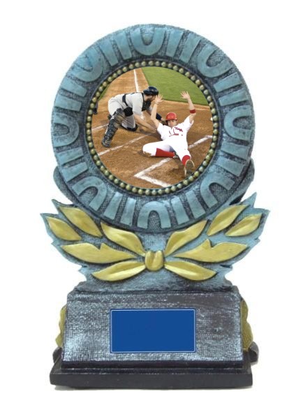 Trofeo in resina. Inserto centrale resinato Ø mm. 50 effetto 3D. Altezza cm. 16 Personalizzazione dell''oggetto con targhetta incisa (inclusa nel prezzo).