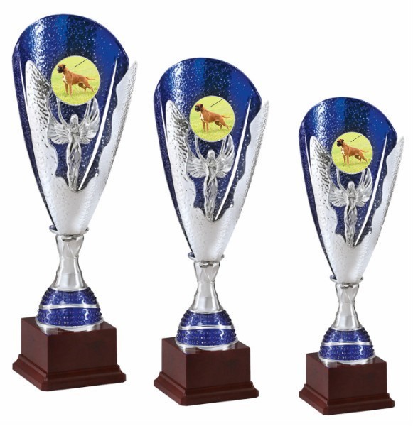 Coppa Trofeo in metallo. Componenti centrali e base in ABS. Inserto centrale Ø mm. 50 effetto 3D. Serie da 3 pezzi: 1° Classificato - Altezza cm. 48 2° Classificato - Altezza cm. 43 3° Classificato - Altezza cm. 38 Personalizzazione sul fronte della base mediante l''applicazione di una targhetta (inclusa nel prezzo).