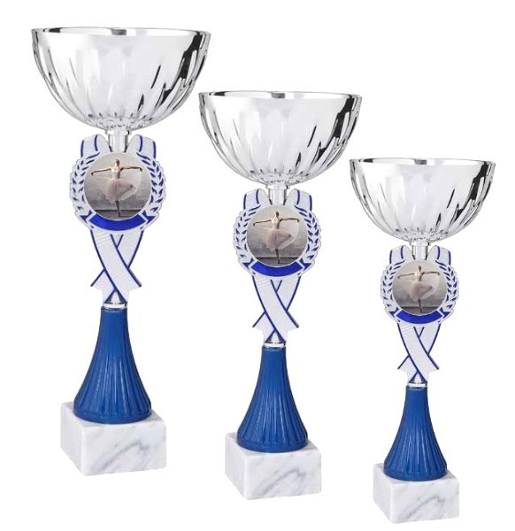 Coppa Trofeo con tazza in metallo. Base in marmo. Inserto centrale Ø mm. 50 effetto 3D con logo. Serie da 3 pezzi: 1° Classificato - h. cm. 37 Ø mm. 160 2° Classificato - h. cm. 35 Ø mm. 140 3° Classificato - h. cm. 33 Ø mm. 120 Personalizzazione sul fronte della base mediante l''applicazione di una etichetta (inclusa nel prezzo).