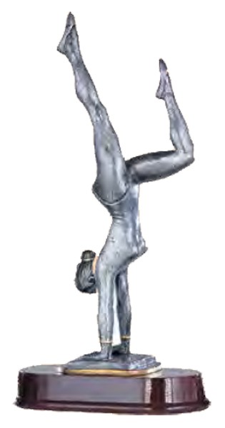 Trofeo ginnastica (femminile) in resina con base in legno. Altezza cm. 33 Personalizzazione sul fronte della base mediante l'applicazione di una etichetta in poliestere adesivo con il tuo testo inclusa nel prezzo.
