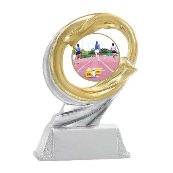 Trofeo in resina. Altezza cm. 17 Inserto centrale Ø mm. 50 effetto 3D Personalizzazione sul fronte della base mediante l''applicazione di una etichetta (inclusa nel prezzo).