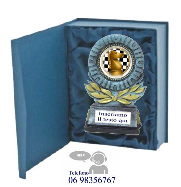 Premio in resina. Altezza cm. 16Inserto con adesivo in rilievo di alta qualità Ø mm. 50 con logo scacchi.Box di presentazione misure esterne cm. 15,5 x 11 x 6