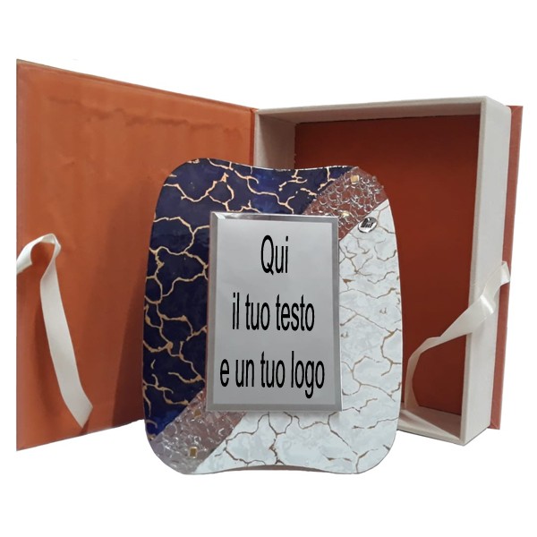 Elegante set con supporto in Murano Glass cm. 24x20 con targa cm. 10x15.Box di presentazione in omaggio.Personalizzazione dell'oggetto con stampa in quadricromia. Oltre al testo è possibile riprodurre un logo o un progetto.
